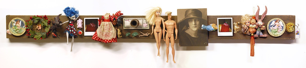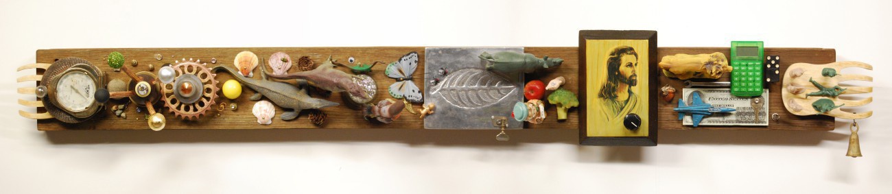 found objects, wood, drawer pulls, plastic figurines,